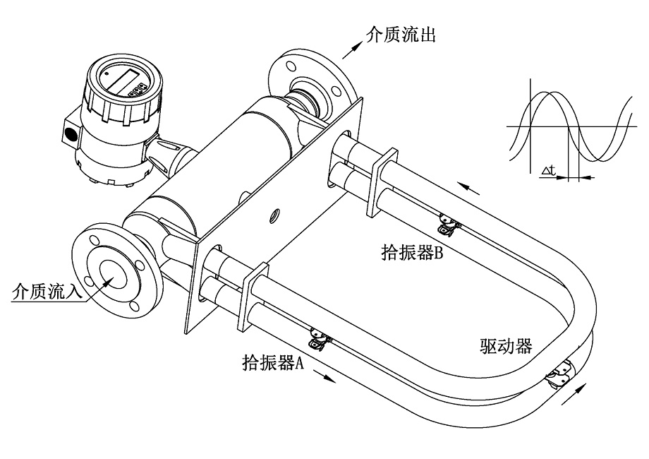 SYZLL系列質量流量計(以下簡稱流量計)的結構是雙彎U形管結構,其測量原理是:測量作用于雙彎管上的科里奧利力(簡稱科氏力)所產生的相位差來檢測管道中的質量流量。