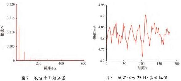 在頻域中對紙漿信號觀察時發(fā)現(xiàn),紙漿信號的漿液噪聲頻帶在零頻率點附近,距離流量信號基波頻率點較遠,對基波幅值和各奇次諧波幅值基本沒有影響,紙漿信號在頻域中的圖形如圖7所示。選擇一組采集的紙漿信號,把其等分成數(shù)段,利用MATLAB計算每段數(shù)據(jù)在基波處的幅值并提取保存在一個數(shù)組中,使用繪圖工具畫出來,如圖8所示。可見,基波幅值在4.7~4.95mV變化,波動較小。因此,提取到的與流量相關(guān)的感應(yīng)電動勢信號幅值會比較穩(wěn)定。