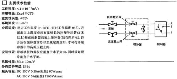 控制器采用膜片式的傳感器,其防爆等級(jí)deII CT5??捎糜诳諝獾纫话銡怏w介質(zhì)和水、油等液體介質(zhì)。控制器的設(shè)定值可調(diào),調(diào)節(jié)范圍0……25kPa。
